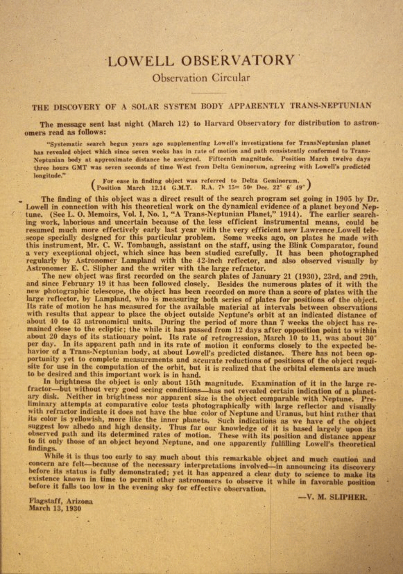 In 1930 staff at the Lowell Observatory issued a circular entitled