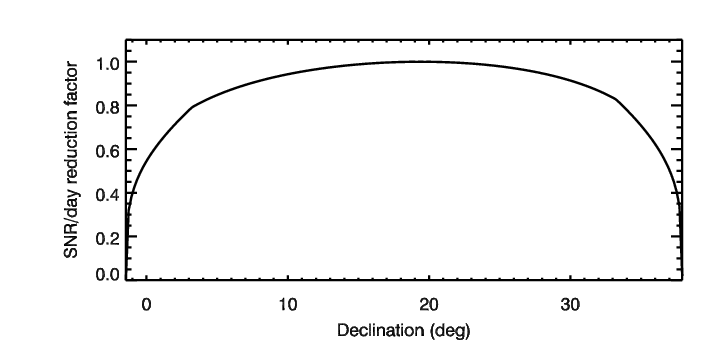 The Arecibo radar can detect a substantial fraction of the near-Earth asteroid population. The figure below shows the expected performance at a declination of 18 degrees, which maximizes track duration. Numbers will be slightly lower at other declinations due to shorter track times and gain reduction. For Goldstone, divide the numbers by 20.